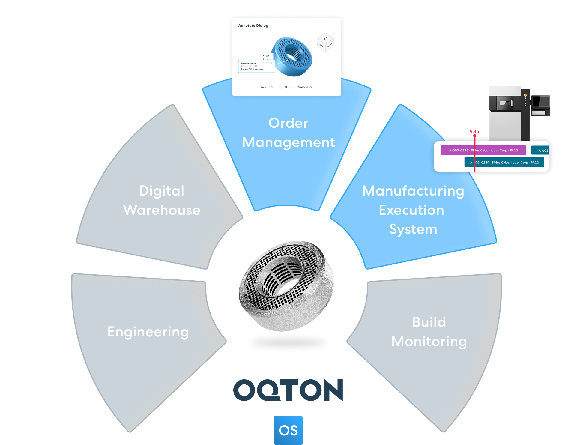 What kind of quality assurance and traceability features does Oqton MOS offer?